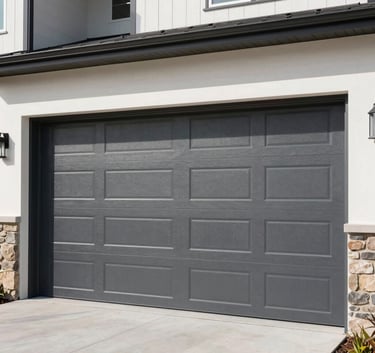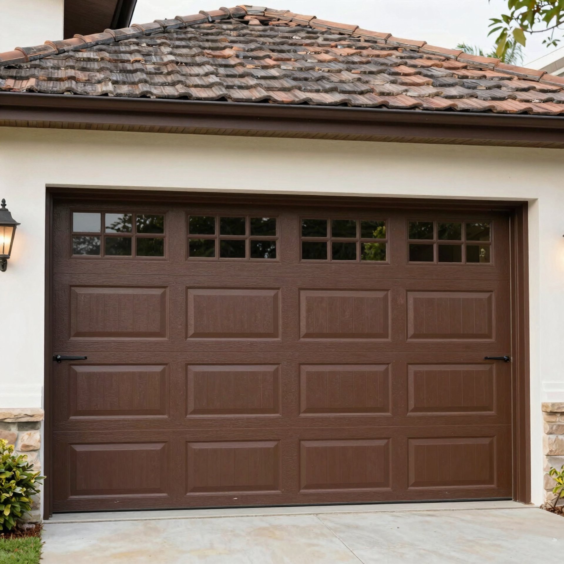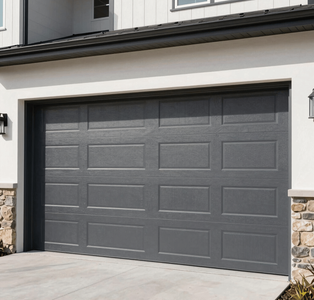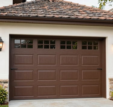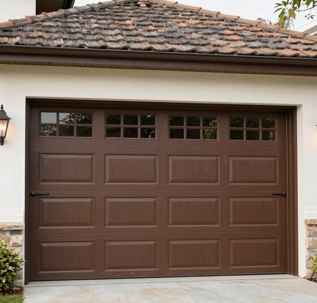 A close-up of a high-quality wood grain garage door panel being fitted into place, North American / US suburban setting, warm afternoon light, detail on craftsmanship.